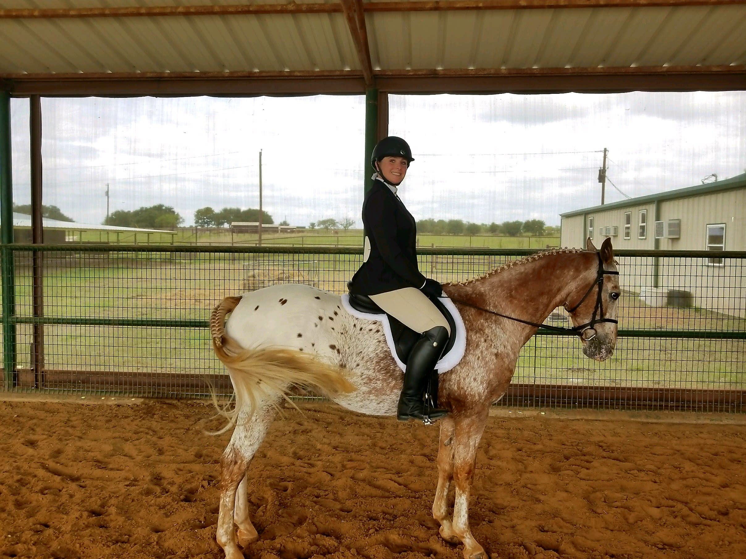 Red’s owner gave us a quick run down of his good points, while recommending that we lunge before riding him (that’s code for “you’ll need a flight plan prior to take off”). She lunged him in a circle and asked him to step out. Neither of us expected him to bust out moves like Jagger, but he did (an absolutely gorgeous extended trot) . I was looking at dressage potential movement (IF you could get him to replicate that leg action with a rider, and if you were envisioning an appaloosa dressage horse). Red also knew a trick. Apparently whoever had trained Red, was vertically challenged, so he had been taught to park out like a Saddlebred when you mount and dismount. This is when a horse walks his front legs forward while leaving his back legs stationary, handy because the stretched horse is closer the ground and it’s difficult to gather up for a buck when you are doing the equine version of a split.