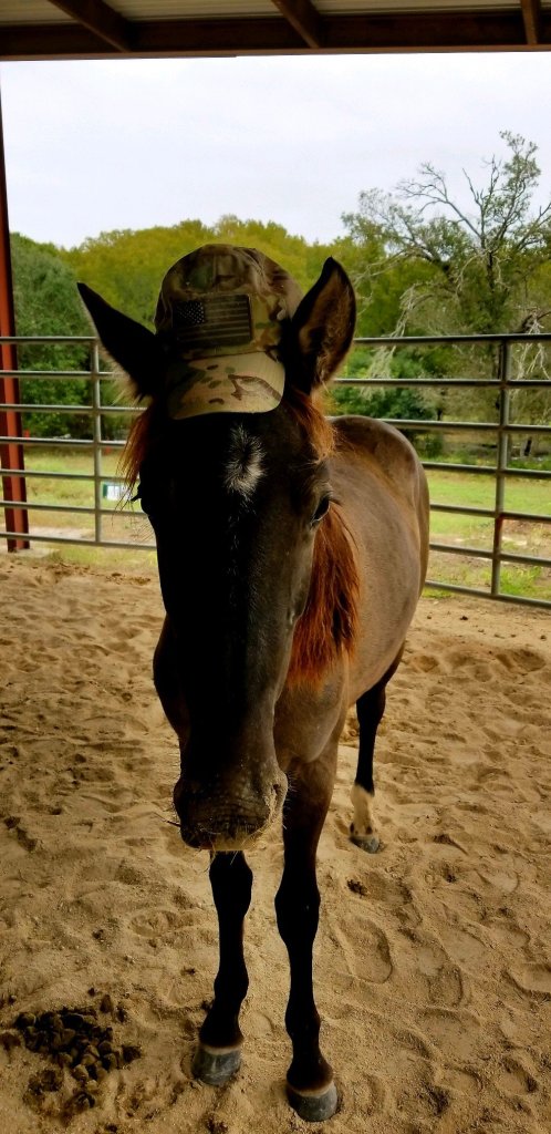 Koda’s arrival on the farm was pretty anticlimactic after the M&V 2018 graduation ceremony. We kept her in a round pen for two weeks before introducing her to the other horses. There are currently two mustangs from Koda’s adoption event running wild in the suburbs of Killeen, that animal control has failed to capture, because their adopters seriously underestimated how high the animals could jump. Koda may not be tall, but she can clear a four foot obstacle from a standstill, which she proved by clearing our box stall gate her second day on the farm while tied in the stall. We’re still not sure how that even happened.