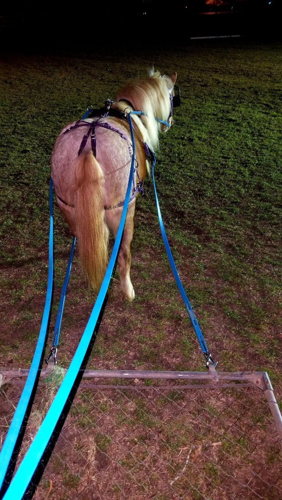 Dragging the gate with one hand, leading Apple Jack with the other, I judged how crazy she may get when the thing was following her. If she can stand the racket of this gate, we’re totally going to be ready for the cart. Like most of my horse training, this happened in the dark. Offspring needs supper, a bath, and a bedtime story before mommy gets to play with her ponies.