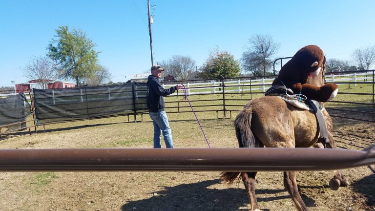 Meet Mad Max the Monkey! Max is a trick riding expert! He can ride anything a wild bronc throws at him, but remains “soft” to the horse. This builds the horse’s confidence in having something flopping around in the saddle. Horses new to the whole riding thing are also usually afraid of anything higher than their head. Mad Max sits tall initially to prove they have nothing to worry about. Koda and Mad Max spent four hours of quality time together on Saturday while we worked almost every other horse on the farm. Koda even decided Mad Max should experience a good roll.