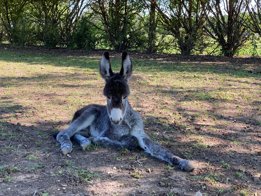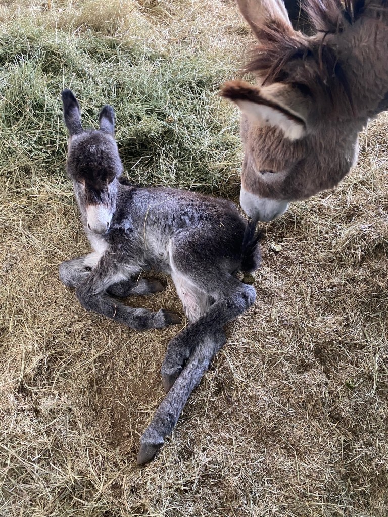 Tuesday morning while I was stuck on the never-ending conference call. Literally. It was an online software marathon training course that started at 8:00 am and was continuous through 3:00 pm. As I’m sitting there trying to focus, Darling Husband comes running in shoving his phone in front of my laptop screen. By his level of excitement I think this virus has turned into a zombie creator, and we should be pulling guns/ammo out of the safe and sharpening machetes to prepare for the coming invasion. It was nothing so disastrous, but it was more exciting. Our newest adopted BLM burro, Mesquite had foaled in the night. We knew she was possibly pregnant, but she wasn’t showing signs of an imminent delivery. I figured the way my luck goes, she would wait until my first day back in the office before dropping it on the ground, but instead she waited until the most inconvenient day of quarantine.