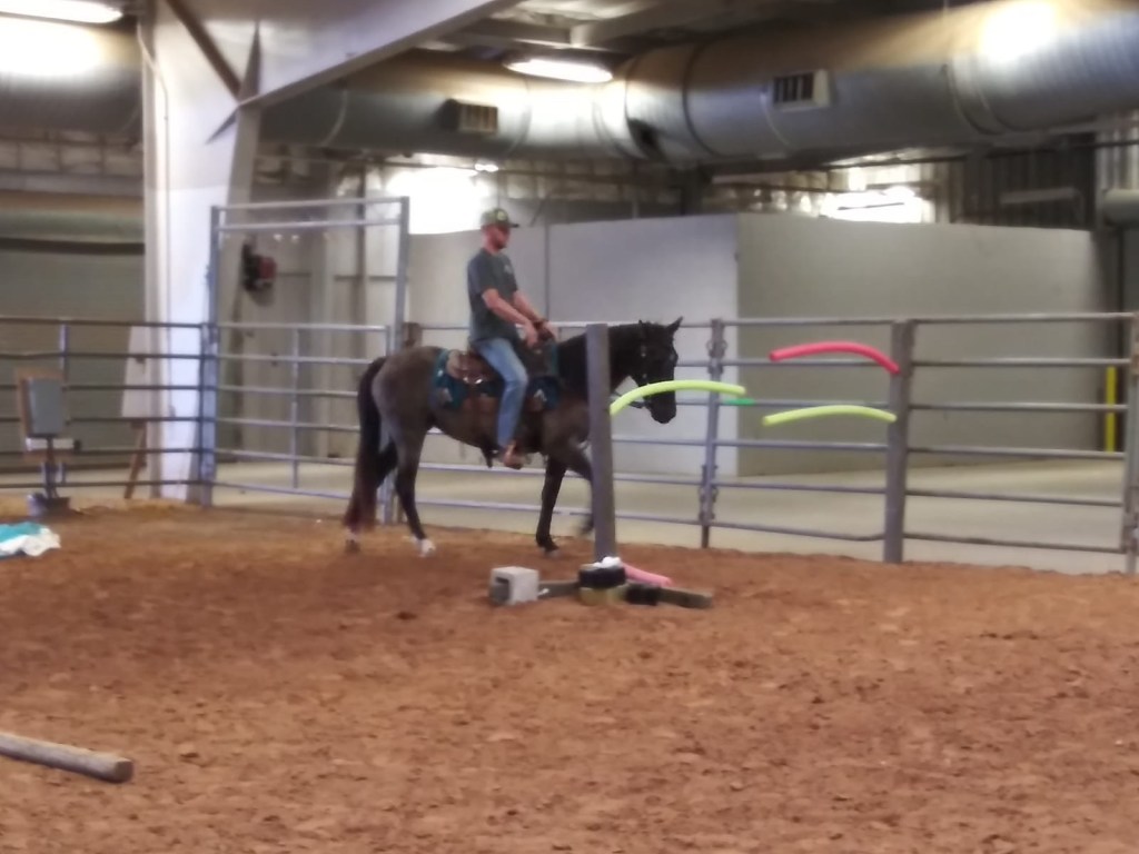 Koda returned to us from Moore Horsemanship about two weeks ago where she spent between 90-120 days being saddle trained. Darling Husband has been gaining his confidence and getting to know Koda in the round pen, but hadn’t ventured into a wide open riding space since bringing her home. We spent a little over 5 hours at the Bell County Expo on Sunday. The indoor arena was an entirely enclosed, the outdoor arena was open at both ends. Ms. Pizazz’s clinics are designed to challenge and more specifically freak a horse out in a controlled environment to prepare both horses/riders for things they may encounter on the trail or parade route. This clinic came complete with a visit by the fire department who ran through the spectrum of their siren and light patterns.