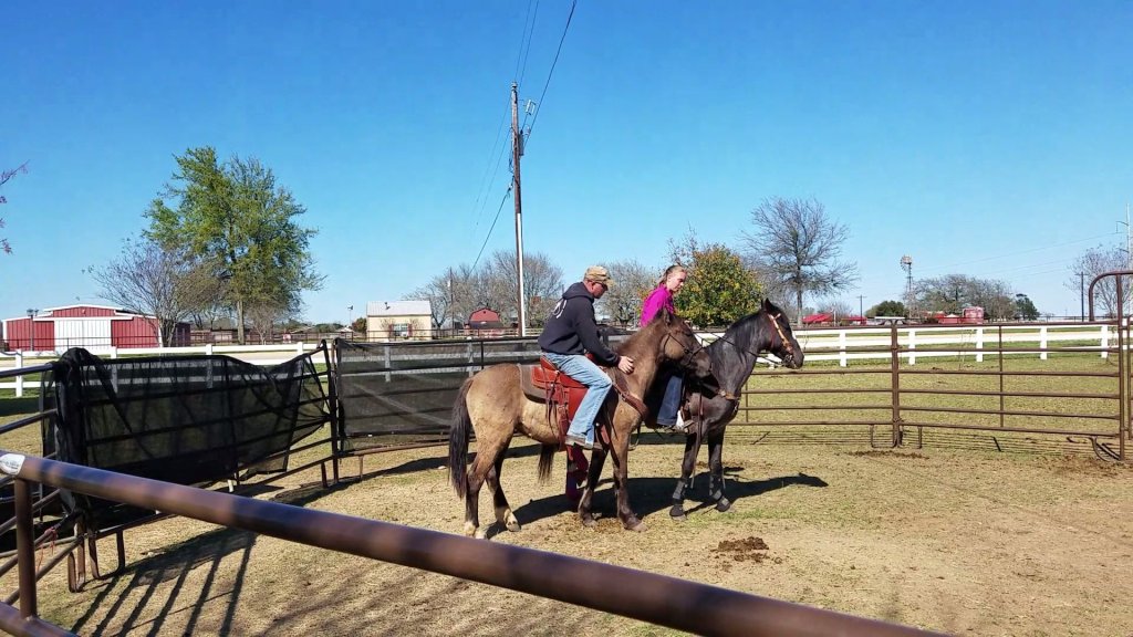 I really liked the plan, and was almost immediately more tolerable. There was just one problem. None of the stangs were started under saddle yet. Darling Husband had sat on Koda’s back and been ponied around our round pen courtesy of Great Friends. I really need to get more creative with their pseudonym. Anyway, Johnny Cash was no longer attempting to kill me. He realized there was some redeeming value to me in the form of cool showers on hot Texas days and treats that I magically produce from my pockets. I had ridden him around the round pen bareback once. Darling Husband had only sat on Denali bareback once.