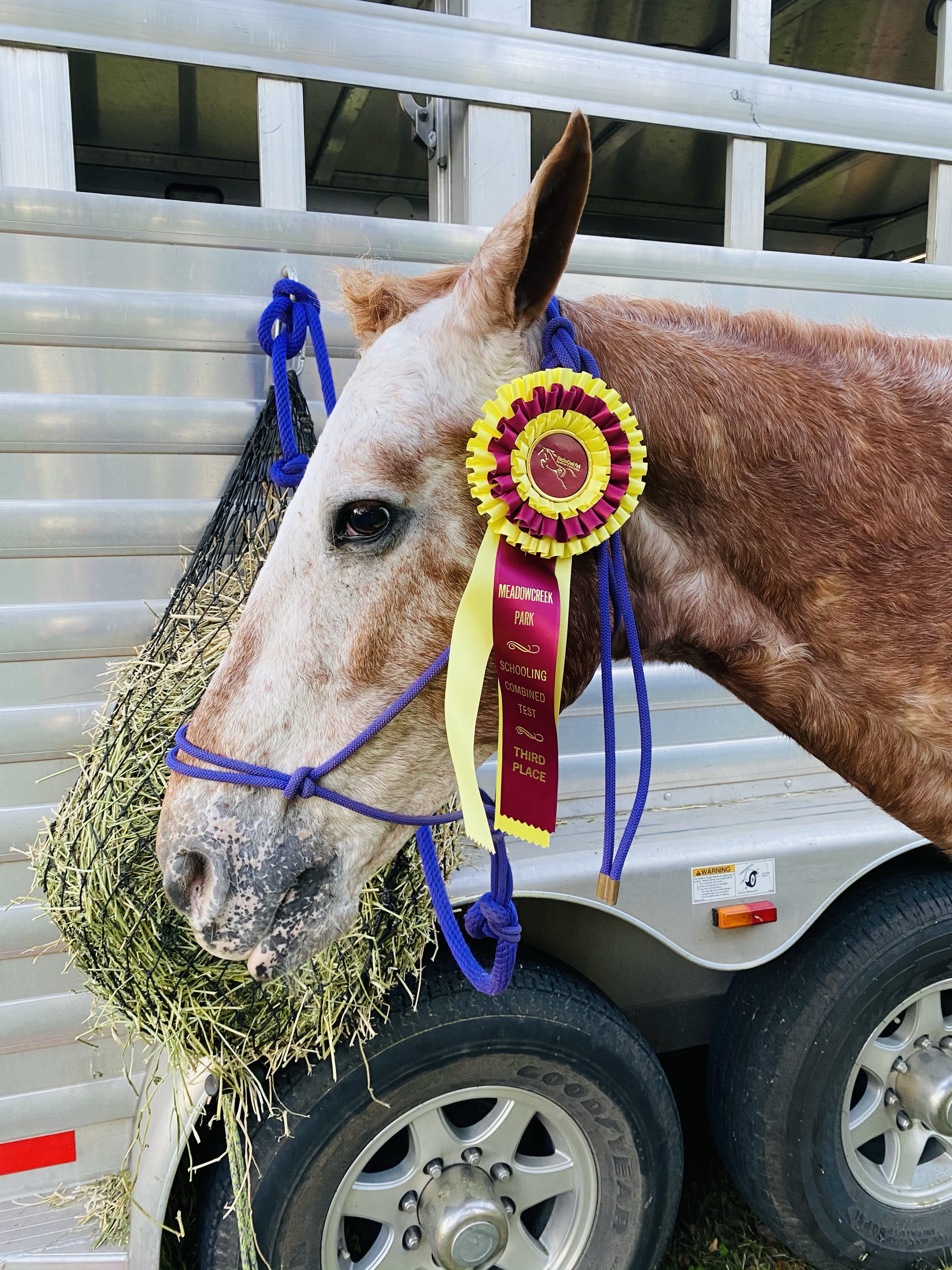 Dressage Queen and I ended the event better than expected. We both brought home ribbons, and placed in the top half of our division which isn’t too shabby for a first time event on very green horses. This show was also a nice validation that my time on Comanche has not been wasted. I’ve competed with Comanche at breed shows where he is seriously out classed by expensive horses bred for a certain type of movement. Nothing is questionable about their pedigrees, age, or former training. Hunter under saddle isn’t exactly what we train for, but until this event it was the only class I had as a barometer of our training progress. It was refreshing to be at a competition where trainers weren’t warming up, riding, and prepping horses for their riders. Despite our weak dressage performance, we still ended up in the top half of our division.