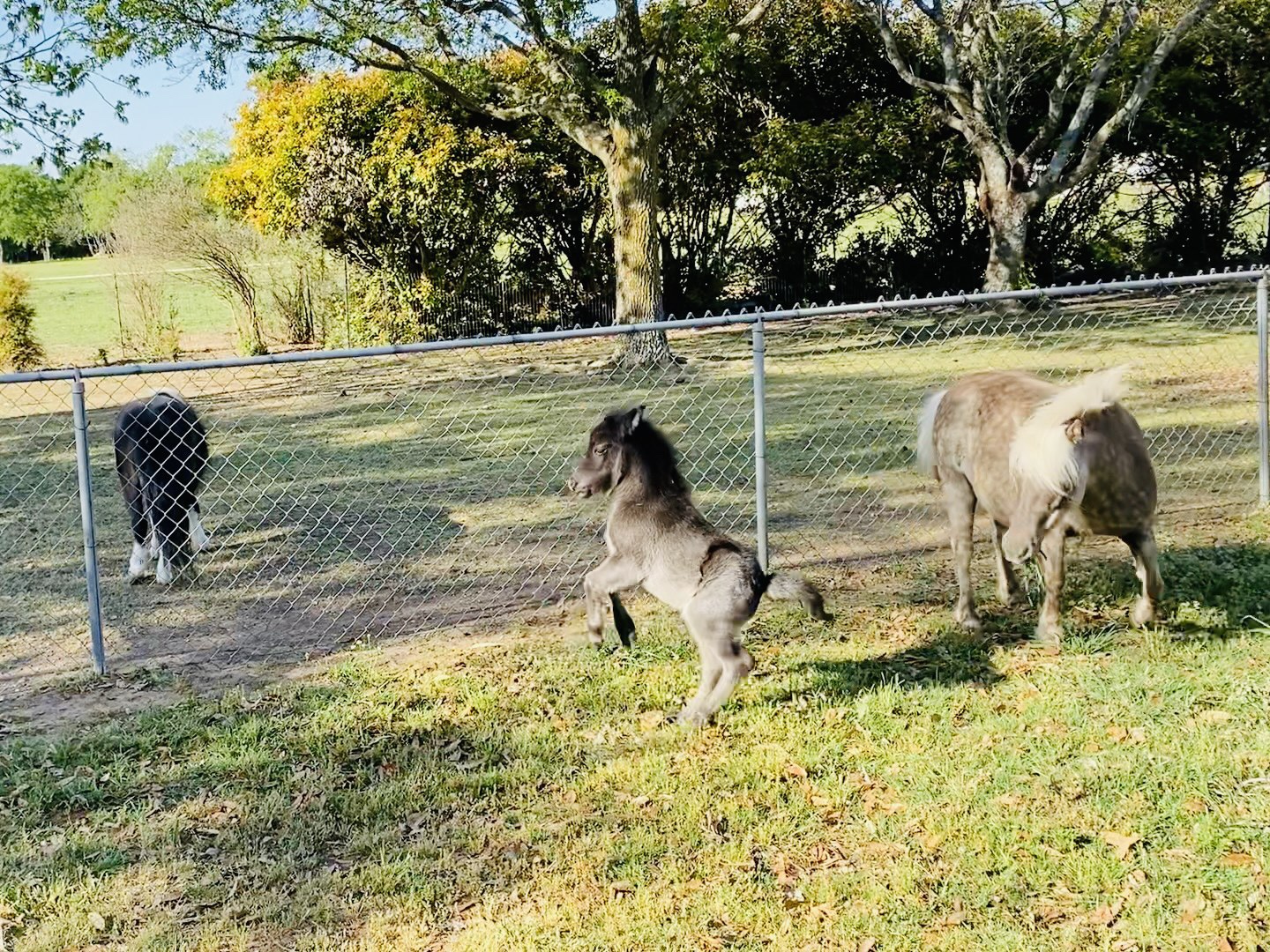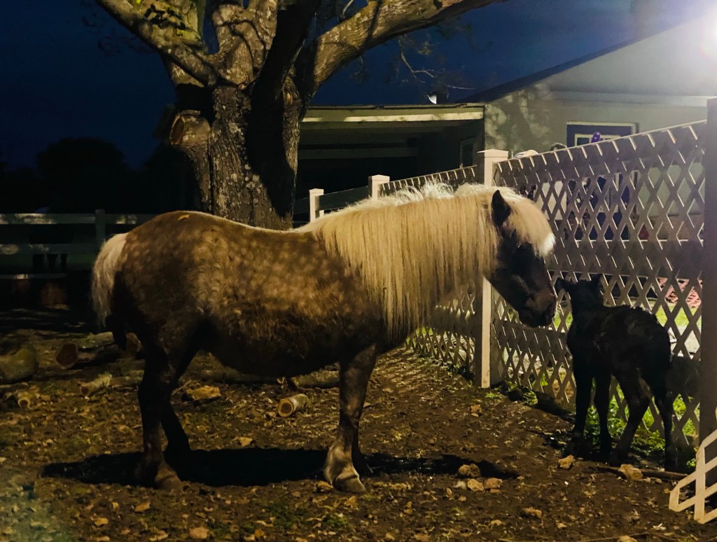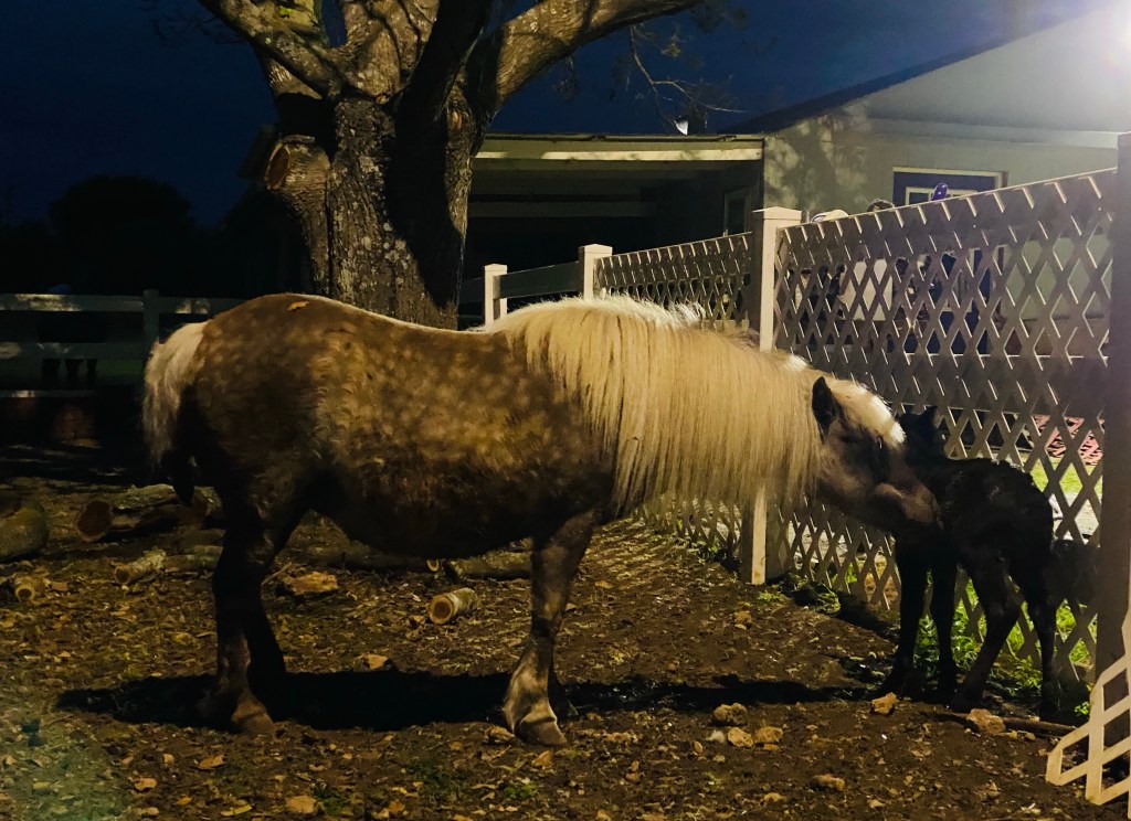 It was a chilly spring morning (for Texas), meaning I needed a sweatshirt with my shorts. I had just started a pot of coffee at 6:30 am, and was sneaking out with a bag of plastic eggs filled with chocolate and small toys to play the part of Easter bunny before Offspring woke up. It was still dark outside as I began to hide or more like strategically place in plain sight my sack full of eggs. The chain link fence to our backyard is the border between yard and pony paddock. While I’m stumbling over toy construction equipment that Offspring tends to leave everywhere in my pre-coffee stupor, Beau Pony bumps the chain link with his nose and whinnies. I look up thinking that he is begging me to find something edible in the house that a pony may enjoy. I glance past him looking for his side kick the expectant Summer Cloud, and she’s not alone or expectant any longer.