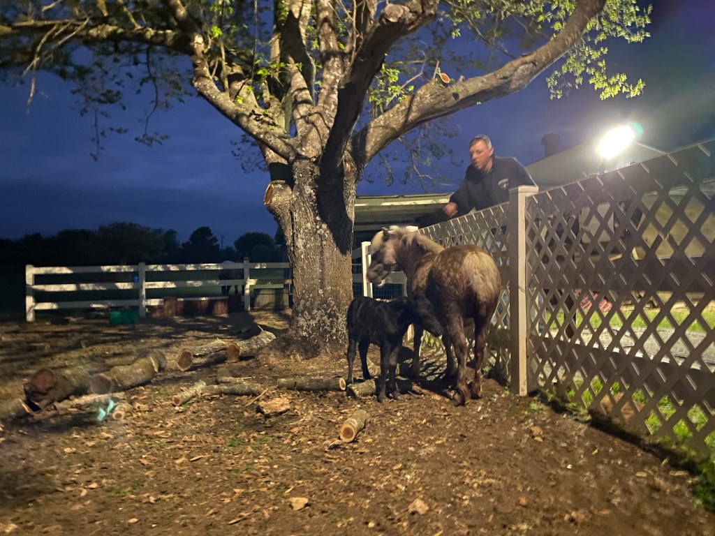 There standing nose to nose with her is a still wet, shiny new foal. Beau Pony looks at them, then back at me like “How does this keep happening?”
