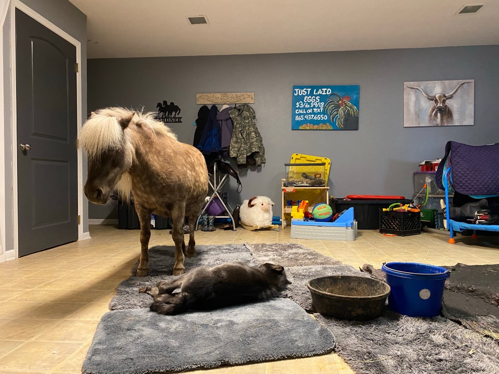 I go about pushing toys against the wall, picking up anything I think a baby could trip or get tangled in, and then throwing rugs over the linoleum we didn’t bother to replace during our remodel because we couldn’t make up our minds what to do with this room. I have a huge stock pile of rubber backed bathroom rugs, that won’t slide and allow both mommy and baby to find some traction. “All good!” I say returning to the barn, and grabbing Summer’s halter. Darling Husband picks up baby, and off we head to the house. We lay baby down on a rug, and bring momma over beside him.