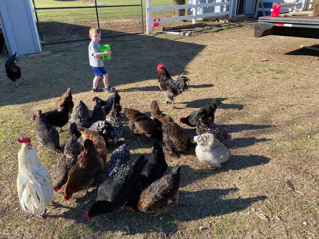 For now I curse the chickens as I trip over them on my way down to the barn. I laugh hysterically as 60 plus chickens follow Darling Husband wherever he’s headed. When Offspring is bouncing off the walls I send him outside to chase them knowing there is no chance he can actually catch them. On the upside, we’ve had a more consistent egg supply than previous years. We supply eggs to the farmer’s market next door when their chickens don’t produce enough to keep up with demand. Thankfully we have friends with a bakery that are more than happy to take farm fresh eggs off our hands. Offspring is building a nice little savings account from his egg sales. He’s probably the only one seeing any profit from the farm!