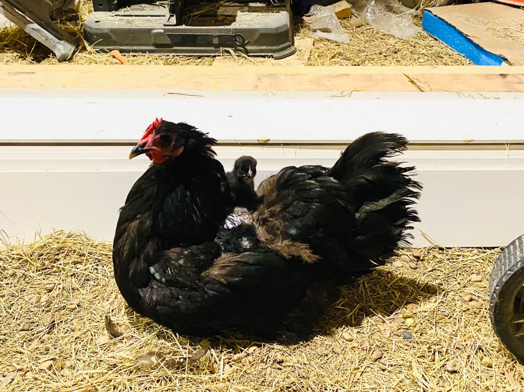 So Darling Husband places his order with the chicken supplier and a few weeks later 10 newly hatched peeps arrive. That brings us to around 45-50 chickens. I think we’re good, a few too many chickens, but inevitably some of these peeps may not make it to adulthood or a few of the existing ladies are going to cross the rainbow bridge in the near future. Two weeks later Darling Husband gets a call from the chicken supplier that the breeds he requested that were on backorder had arrived. So now we add another 12 or so peeps to the mix. To make things worse, some little chicken goes MIA. Its sad. We assume she’s dead. There is a brief moment of silence in her honor. Apparently the MIA chicken was just playing an Olympic level game of hide and seek. She survived on her own hiding in the horse pasture, with minimal coverage, during some of the craziest hail storms of the spring and returned 21 days later with 6 little peeps she hatched all on her own. I admire her commitment to motherhood, but I steal all of her babies to put them in with the rest of the “store bought” peeps. Experience has taught me that mother hens get bored with motherhood after about three days, and the other adult chickens will peck the babies to death.