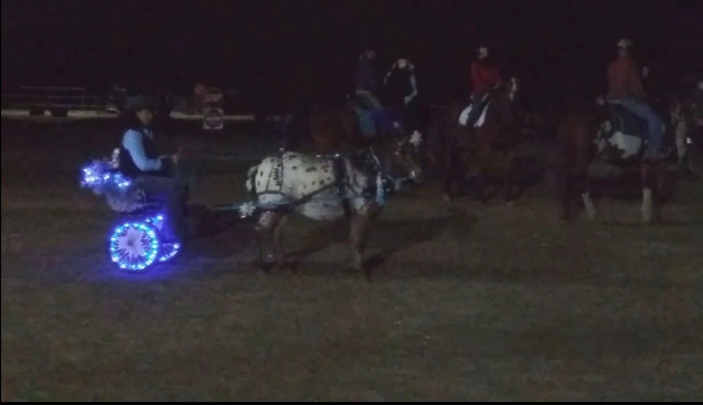 Now I’m not going to gush over how the ride takes you through (I’m estimating distance) 7 miles of hundreds of Christmas light displays by the lake. I have other blog posts Here that you can read. I will say this year was the largest ride ever with over 100 horses and I have no idea how many people participating. This post really is about how awesome, my little pony, Dixieland Delight aka Moonshine is. The GHLHF wasn’t sure the ride would happen for us this year, but I’m sooo glad we decided to go. The in laws were visiting the few days before, and even though Darling Husband said he was going to do a test run on Koda through Christmas lights strung down our driveway in a controlled stress free environment, it just never happened. He decided to chance it, and despite a few hiccups that can be expected from a young/green horse surrounded by a crazy amount of equine activity, in the dark, with bright flashing lights, and no familiar older horses to boost her confidence, we did actually make it on the ride.