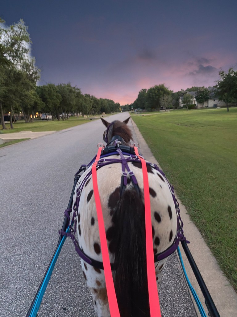 When she saw the connecting road near the top of the grade, Moonshine picked up a brisk trot for the last little bit, and then went right back into her power walk back down the hill. Now we’re still in the pitch black, and the only light is the light coming from the decorations on my cart. We were almost crossing a cattleguard (covered with a piece of plywood) before I could even see it. Then we turned off the road, essentially through pasture on a makeshift road created from ATV and tractor traffic. It felt like we traveled a mile through the field, not sure of the exact distance, but Moonshine powerwalked her way, picking out the best path. When we came up on a 10 foot by 4 foot puddle that spanned the entire path, she went to the side, and thankfully there was enough solid ground for the cart to get around. Koda was behind us getting the benefits of the cart lights and Moonshine’s expert navigation. I barely picked up the reins the last mile and a half. My pony was totally on autopilot. Finally we could see the ranch lights, and Moonshine brought us in strong. I literally had to hold her back at the end.