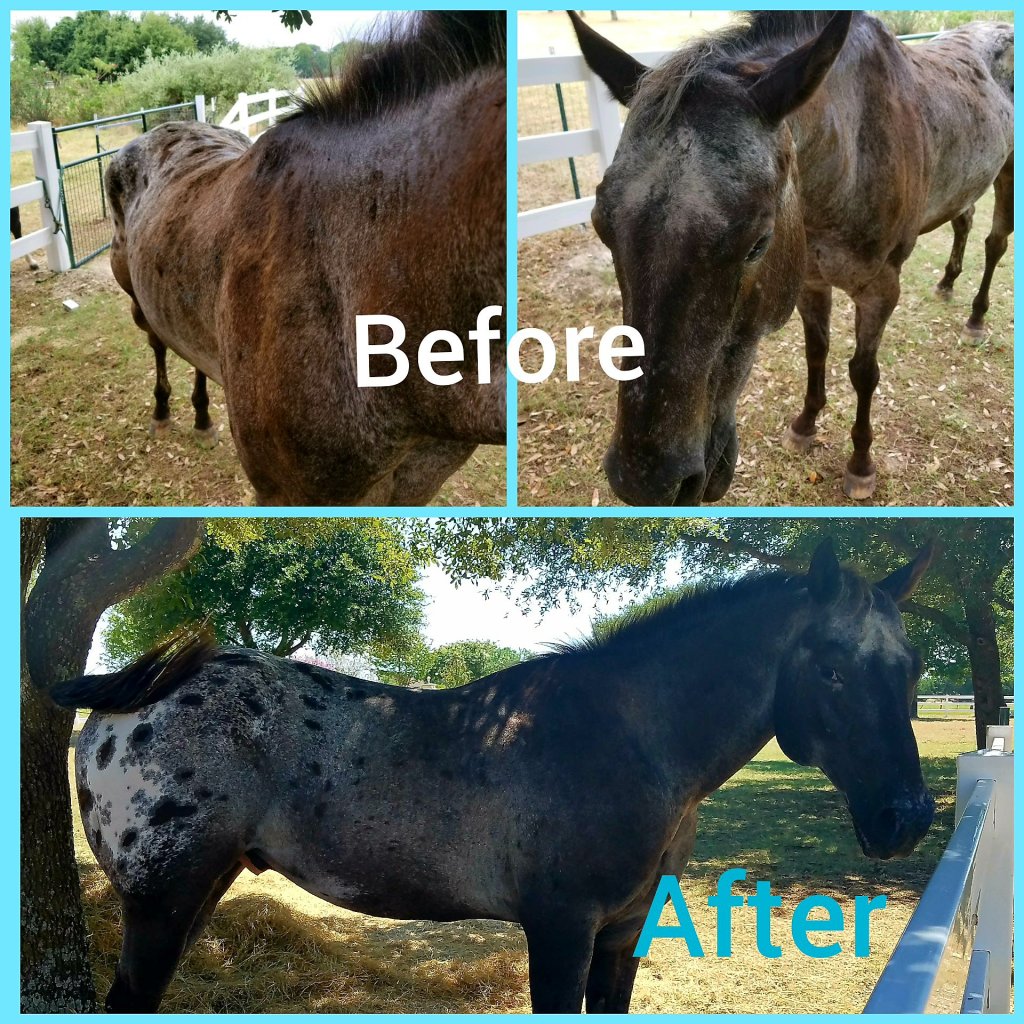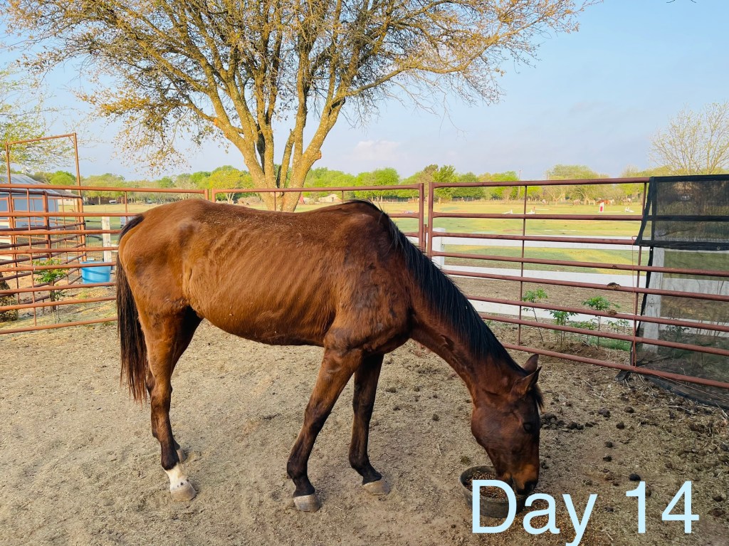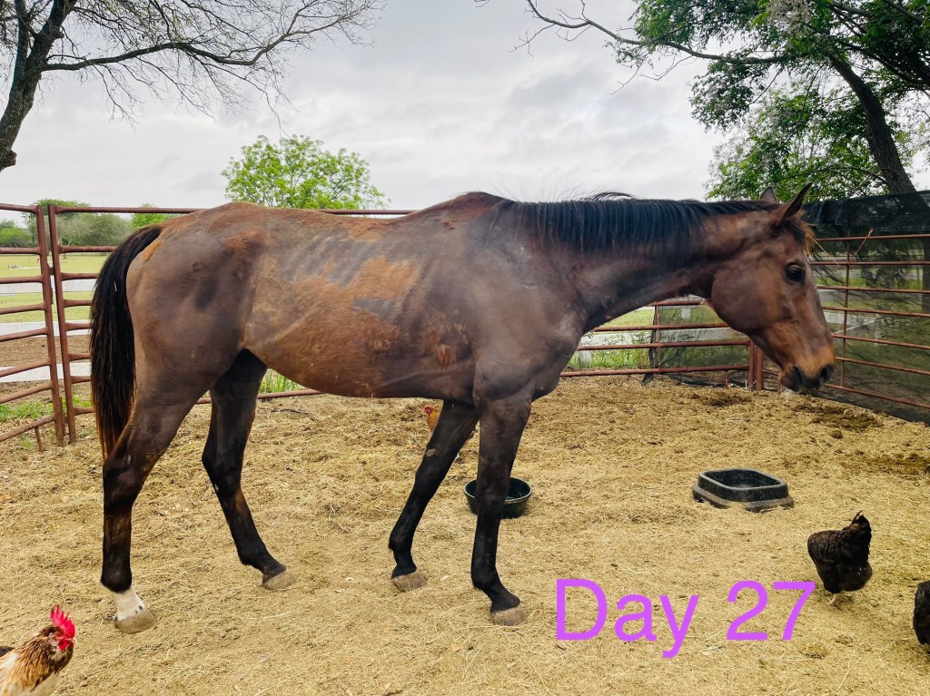 I kept feeding the horse as much as I could without causing her to colic, hoping The Artist wouldn’t find a better prospect before I could get this horse looking better. Thankfully I took a photo of Portfolio Mission minutes after unloading her. At day fourteen in the rehab process, I was feeling disheartened that we weren’t making progress. I snapped a quick picture with my phone, and when I compared the initial photo side-by-side to the day fourteen photo I immediately noticed the difference. There was hope. We kept going.