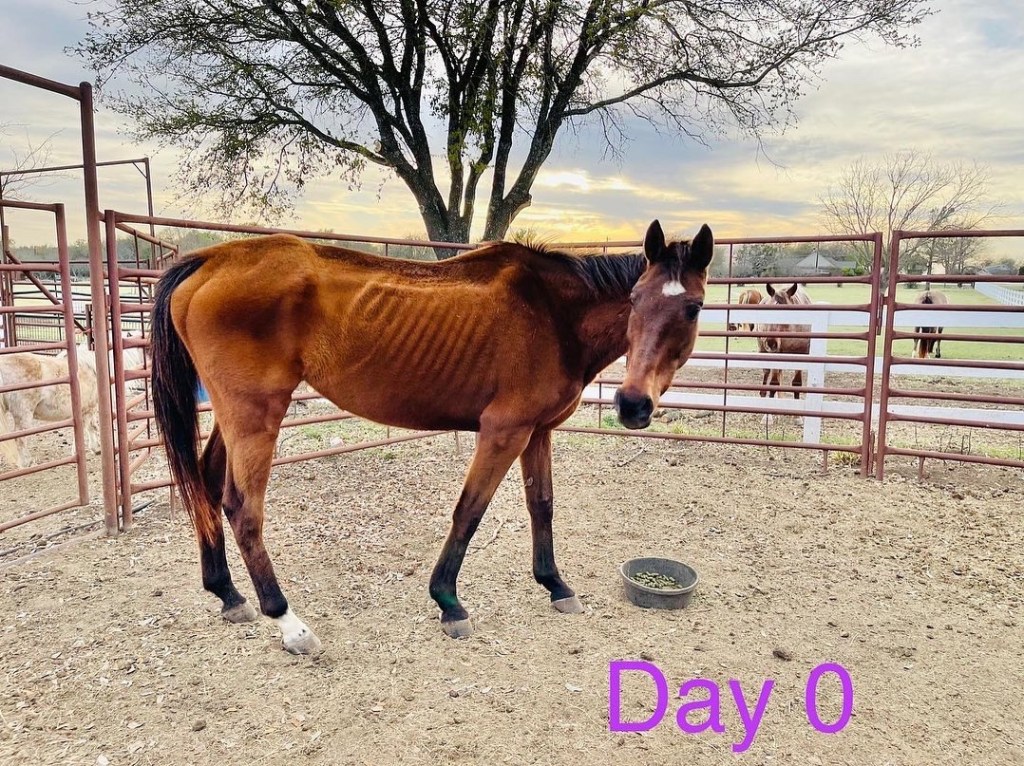 Many of my non-horsey friends like to send me links for “free” or “cheap” horses, not understanding that these are anything but “free” or “cheap.” Non-equestrians don’t know that the purchase price is the least expensive part of horse ownership regardless of that initial cost. The “free” ones usually cost a lot more than a purchased horse in the end by the time you factor dollars and hours spent rehabbing the animal. So, I went to work on this “free” horse. Not to brag, but I do possess a special skill set. Making things, including myself, fat is a gift.