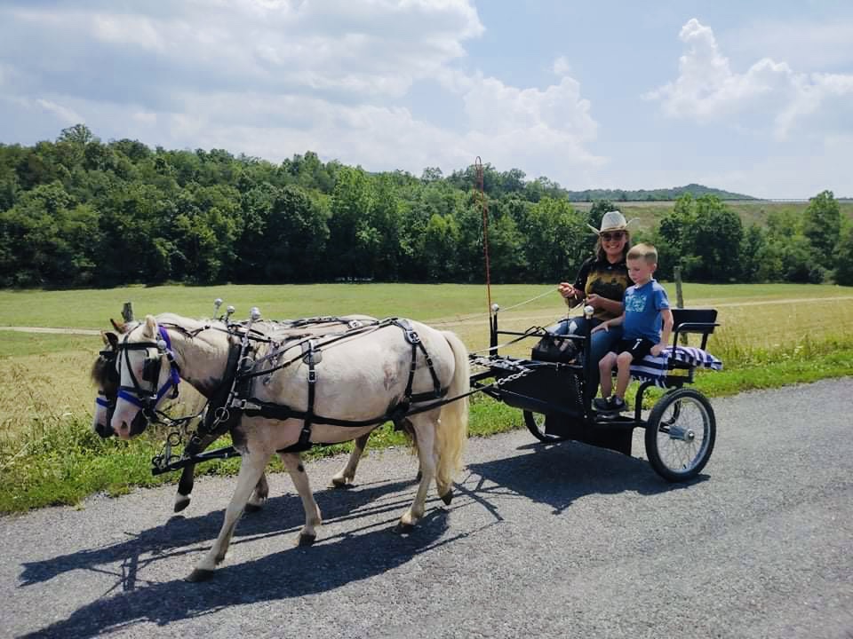 Back down the steep incline we went, past Pony Queen’s driveway to hit what West Virginia natives consider a “flat” road. The interpretation of flat is a bit subjective in this state. Anyway, this is the point where Offspring and I had the opportunity to view some of the prettiest landscape North American has to offer, and I’m very jealous I do not get to enjoy it in the fall when the leaves would be in full autumn colors. Also, coming from a severe drought in TX, the greenery was enough to bring a tear to the eye. Pony Queen’s team were angelic and took excellent care of us the entire route through many tops and bottoms during the drive. Pony Queen’s two single driving ponies were complete saints even if one did seem to possess a sense of humor.