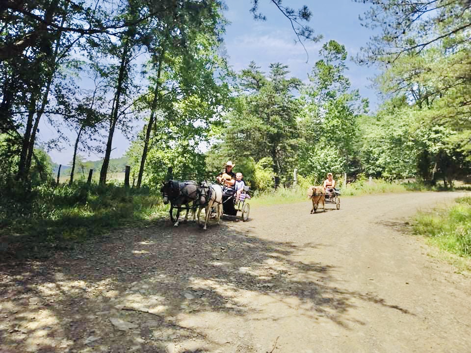 Off we went Pony Queen and her little fire cracker of a pony leading the way, Offspring and I with the team in the middle, and one of Pony Queen’s friends bringing up the rear. Down, down, down we went, and then turned sharply left to face an equally steep up hill grade. The little team chugged up the hill apparently unfazed and not aware there was any other form of driving. When the road finally leveled out and looked out over a field leading into the woods, I was informed we would try a little off-roading. I’m not opposed to off road trails, but I’m well aware of the size of the rocks jutting out of the floor of the average WV forest. All of us were in easy entry carts with axels that provided little ground clearance. As we headed across the meadow and then started down another steep incline, Pony Queen yells that we need to sit firmly in the center of our cart seat, or the cart would tip over in the creek bed, stream for you city people. Then straight up another hill from that stream. We stopped at the top of this hill, finally having found the road again, and gave the ponies a breather.