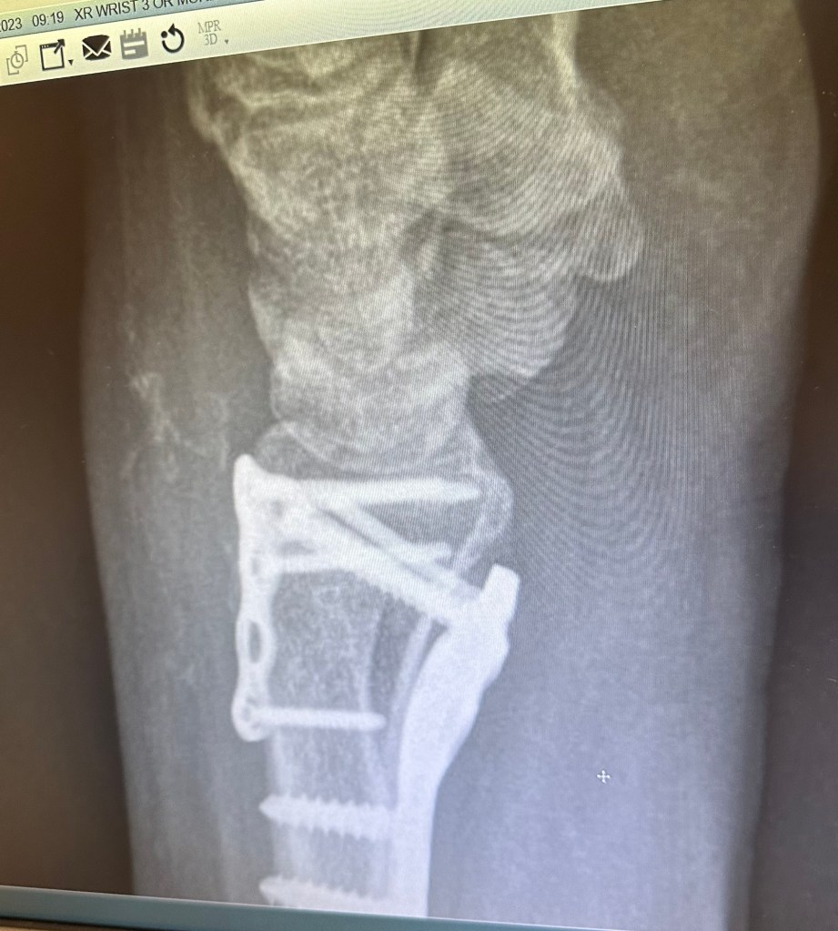 Now I in no way blame the animal for what happened. It was simply reacting the way a horse does when confused, frightened, or both. There were a few miscalculations on my part, and since we don’t start many animals, I was working with less than ideal facility conditions. I ended up being thrown into our steel corral panels, but more importantly landing awkwardly on very hard ground which resulted in a crushed wrist. So now I’m sporting three steel plates in my wrist and my range of motion is not the greatest.