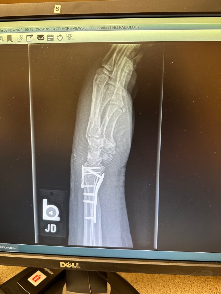 Anyway, Salem bucked several times. I came off and ended with a crushed wrist that required surgery. Shortly after, my day job “got really interesting” and two weeks post-surgery required travel and a lot of overtime. My left hand was virtually useless anyway so Salem got a 30 day break from training. So here I am with a bum wrist, a not very tame mustang, and 9 months to see if I can make this goal happen. Its not looking good, since I’ve wisely decided to find a colt starter with better facilities to put 30 or so rides on her before I try it again.