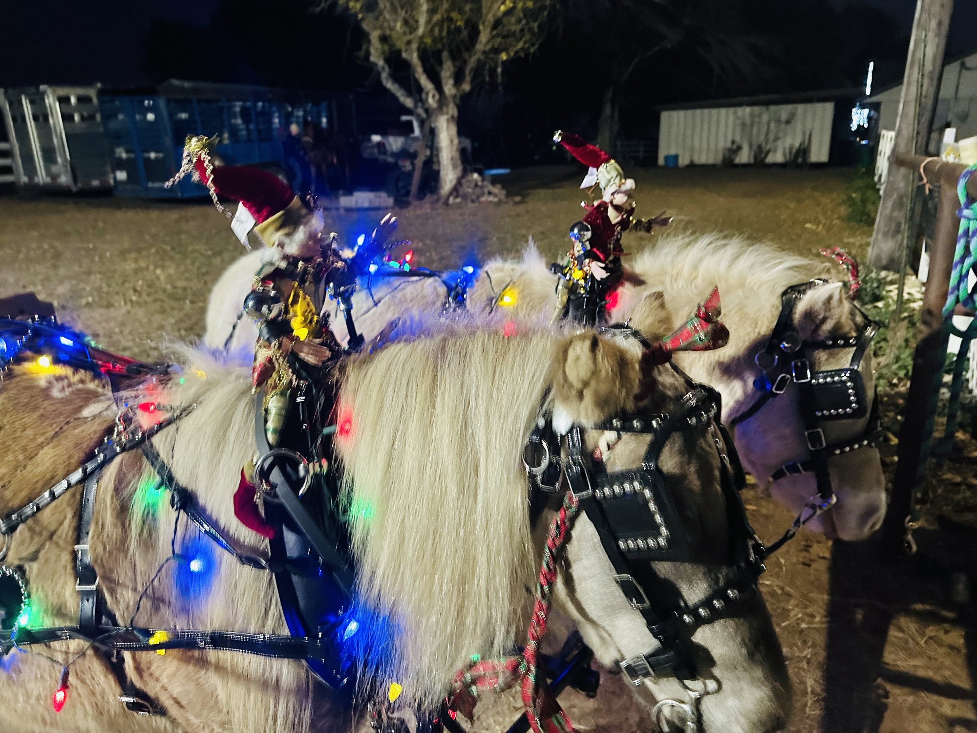 Summer and Tinsel began their team driving pulling the wagon for the first time, one week before the first Christmas parade. That first drive was not without it’s difficulties, but most major issues (harness, hitching points, rein adjustment) were resolved by drive number two. By our fourth drive Summer and Tinsel were behaving like an experienced pair, and I decided that despite their relative greenness, they would be my pair to complete the Belton Christmas parade. The parade route itself is not that long, but the line up starts on a steep hill, and the return route takes you on back streets to the interstate frontage access road, with cars flying past at 50mph. I needed animals with longer strides that would still be fresh enough to high tail it back to the trailer.
